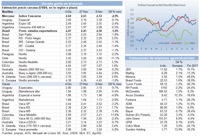 在比索近兩周小幅增值之后,出口閹牛價格穩(wěn)定在上周的水平,最好的閹牛90-92比索,印度串種牛87-89比索,優(yōu)質(zhì)和特種母牛76-79。