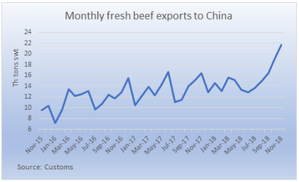 中國十一月從烏拉圭進(jìn)口超過2萬噸牛肉