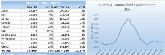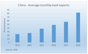 近十二個月牛肉出口總值達(dá)到16億美金,如果算上副產(chǎn)品和成品,總值達(dá)到19.4億美金,比2017年高4%,出口總量方面跟2017年相差不多,大約45萬噸。