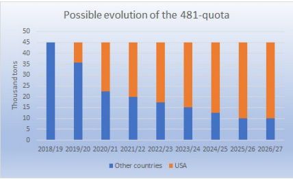 美國(guó)與歐盟已經(jīng)就481配額達(dá)成協(xié)議,歐盟初步給美國(guó)1.85萬(wàn)噸的獨(dú)家配額,六年半之后逐步增加到3.5萬(wàn)噸。481配額總共4.5萬(wàn)噸,分四個(gè)季度,每季度1.125萬(wàn)噸,由美國(guó)、烏拉圭、阿根廷、澳洲、新西蘭和加拿大分配。協(xié)議生效后,原有國(guó)家配額將在2020年上半年先減少9250噸,然后每年減少2500噸,直至2025/26年減少到只剩1萬(wàn)噸。近幾年烏拉圭和澳洲每年各用掉1.6萬(wàn)噸481配額,他們的配額將會(huì)大幅減少,阿根廷481配額增長(zhǎng)也很迅速,去年達(dá)到6800噸,也會(huì)受到配額減少的影響。
