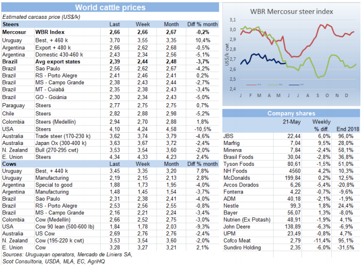 南方共同市場閹牛價格連續(xù)三周保持在2.66美金/公斤,烏拉圭牛價大幅漲到3.7美金,而阿根廷和巴拉圭略有下跌,巴西閹牛價格由于雷亞爾貶值更是跌了5美分。