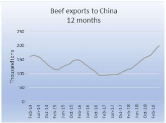 截止到五月的十二個月內(nèi)澳洲共對中國出口19.9萬噸牛肉,同比兩年前的9.6萬噸翻倍還多。對中國出口穩(wěn)步增長,五月中國是澳洲牛肉第三大主要出口市場,共進口2.3萬噸,僅比美國少355噸,日本還是最大市場,進口2.68萬噸。五月澳洲共出口10.55萬噸牛肉,同比減少4200噸,截止五月澳洲共出口46.9萬噸,同比增加8%。