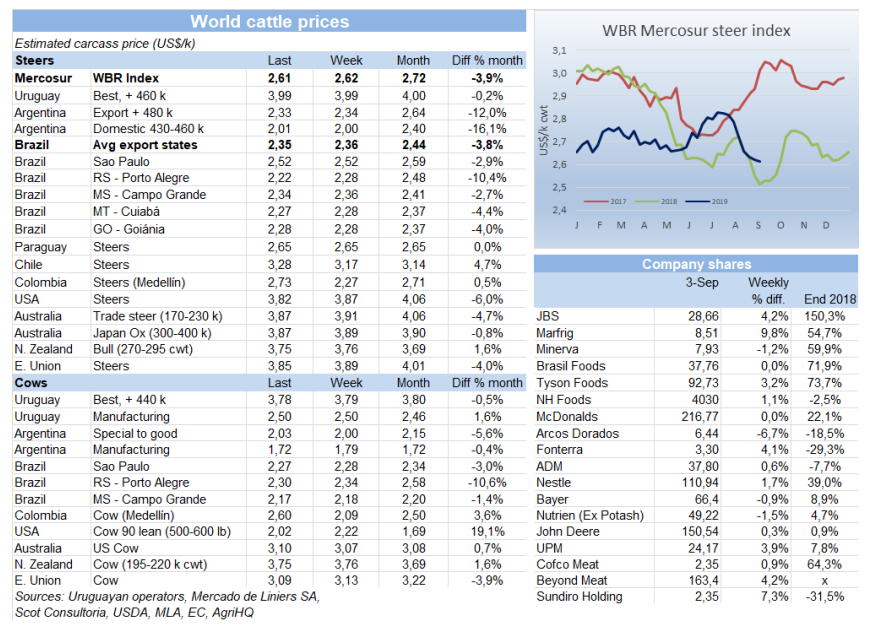 盡管阿根廷經(jīng)濟(jì)狀況微妙且因初選之后一系列情節(jié)變化無常。這標(biāo)志著相比于執(zhí)政黨,反對(duì)黨候選人Alberto Fernández Cristina和Fernández de Kirchner獲得了明顯偏愛。目前為止,肉類貿(mào)易鏈未受明顯影響。阿根廷這段時(shí)期經(jīng)歷的危機(jī)中限制購買美元這一經(jīng)濟(jì)