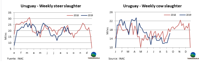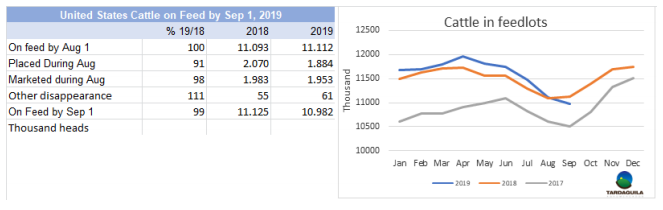 (3998頭),Las Piedras (3644頭),NH-BPU(3637)。Marfrig三家工廠共屠宰9519頭,Minerva兩廠共屠宰7513頭。9月截止目前,共屠宰122334頭牛,比去年同期減少7.3%,預(yù)計(jì)本月屠宰量將近17萬(wàn)頭,比2018年9月減少1萬(wàn)頭,年屠宰量的差距將縮小,過(guò)去三個(gè)月屠宰量減少1.9萬(wàn)-2.9萬(wàn)頭。