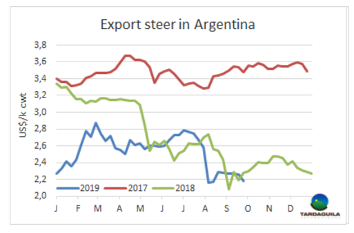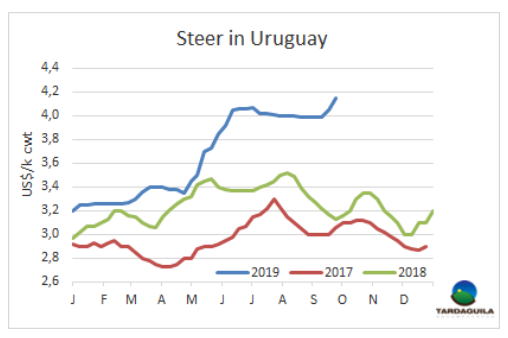 新廠被授權(quán)準(zhǔn)入中國使南方共同市場對中國牛肉出口凈重每月至少增長4萬噸。中國授權(quán)準(zhǔn)入17家巴西新廠,8家阿根廷新廠,1家烏拉圭新廠,現(xiàn)在主要的局限是冷凍能力。這也是之前為了在未來幾個月內(nèi)增加對中國產(chǎn)量進(jìn)行投資的原因。預(yù)計巴西對中國出口量將增加一倍,今年每月直接出口到中國約3萬噸,8月增長至3.7萬噸,對冷凍能力的投資完成后,每月出口將達(dá)到7萬噸。其中一部分來自水漂貨市場,另一部分來自目前輸出的其他目的地,如中東,智利。今年截至目前,阿根廷平均每月對中國出口2.9萬-3萬噸,新工廠被授權(quán)后可達(dá)4萬噸,也需要投資改善冷凍條件。烏拉圭工廠屬于中小型,考慮到其持股人是中國公司,也可以供一些量。2019年前八個月南方共同市場對中國平均每月出口約7.5萬噸,冷凍條件的投資一旦完成,加上準(zhǔn)入的新工廠,每月出口量將攀升至11萬-12萬噸,占出口總量的55%-57%。