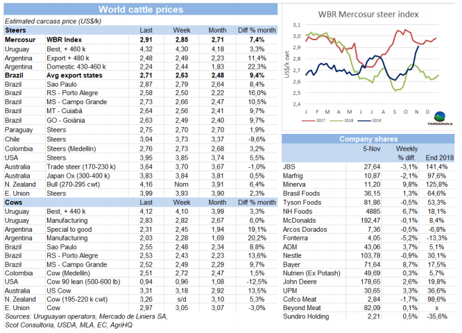 巴西育成閹牛價(jià)格的強(qiáng)勢增長趨勢對南方共同市場有很大影響,本周世界牛肉周報(bào)南方閹牛胴體價(jià)格增長6美分,增長至2.91美元/公斤。兩個月來價(jià)格增長了30美分,增長了11.5%。上漲的多方面原因中最主要一個是巴西。本周在巴西主要的出口州育成公牛平均價(jià)格增長8美分,增長至2.71美元/公斤,主要影響因素是出口需求強(qiáng)勢,國內(nèi)市場月初消費(fèi)增加。阿根廷本周的高價(jià)位保持在上周末大選后的水平,情況很不尋常,老母牛的價(jià)格和閹牛價(jià)格相當(dāng)。烏拉圭和巴拉圭的市場參考價(jià)本周分別增長5美分和2美分,烏拉圭價(jià)格增長至4.32美元/公斤,巴拉圭價(jià)格增長至2.75美元/公斤。巴西