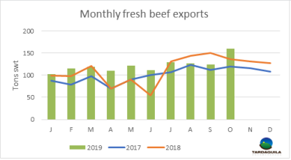 中國市場的更好機(jī)會使冷凍牛肉到歐洲市場出口量減少至本世紀(jì)初口蹄疫危機(jī)后最低水平。根據(jù)海關(guān)出口數(shù)據(jù),10月冷凍牛肉到歐洲出口量僅323噸,今年截至10月,出口量總計(jì)7796噸,比2018年同期減少44%。另一方面,冷鮮牛肉出口至歐洲共1044噸,因?yàn)樯蟼€月481配額范圍內(nèi)的發(fā)貨量幾乎為零。今年截至目前冷凍牛肉和冷鮮牛肉出口至歐洲量減少21%,減少至2.8萬噸。