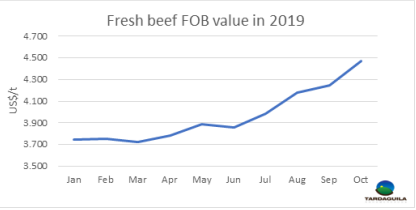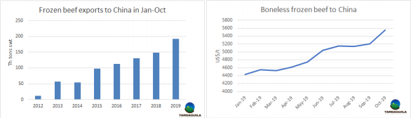 10月烏拉圭共出口冷凍牛肉24165噸,其中出口中國19941噸,約占總出口量的82.5%。上個月烏拉圭出口鮮牛肉26357噸,比九月出口量28882噸有所下降。出口量的減少由于季節(jié)性減產(chǎn)。中國擁有比其他出口目的地更高的價(jià)格,因此中國市場份額越來越高并不意外。10月中國冷凍牛肉采購價(jià)格平均5549美元/公斤,比1月采購價(jià)格上漲25%。今年前10個月,14.7萬噸冷凍去骨牛肉和4.6萬噸帶骨牛肉出口至中國去骨產(chǎn)品和帶骨產(chǎn)品出口量分別同比增長35%和16%。冷凍產(chǎn)品對歐洲出口量歷史最低