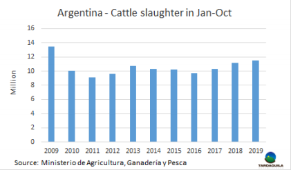 根據(jù)國家農(nóng)業(yè)貿(mào)易控制局的數(shù)據(jù),2019年10月牛屠宰量130萬頭,2019年前10個月總屠宰量達(dá)1140萬頭,這也是自2009年以來同期最大。SWIFT以439,232頭在全國屠宰排名中保持領(lǐng)先,緊隨其后的是Rioplatense(328,405只),Coto Santa Fe(257,388只),ArreBeef(251,689只)和Gorina(246,786只)。
