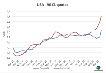 近幾周美國進(jìn)口價(jià)格呈現(xiàn)上漲趨勢,烏拉圭進(jìn)口商稱,現(xiàn)在對于90CL產(chǎn)品來說美國市場和中國市場相比仍有300美元/噸的差距。他說“現(xiàn)在手里前部件套有貨人的都愿意賣中國市場,因?yàn)楝F(xiàn)在其他市場都無法與中國競爭。”