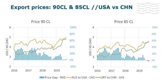 “2020年我們要將進口集中在中美洲國家和墨西哥”一位進口商在美周進口肉類委員會年度會議上說。由于該會議與中國舉辦的進博會時間沖突,來自澳洲和南美的出口商代表團數量很少,來自烏拉圭的肉類代表Las Piedra 和San Jacinto, Marfrig和Minerva多個國家的代表、以及貿易公司的代表參加了此次大會。會議上,烏拉圭肉協(xié)強調了牛肉到中國和美國的出口價格差異越來越小,澳洲牛肉到中國和美國的出口價格差異也越來越小,2019年差距已經趨于零差距。甚至出口到中國的85CL和90CL產品價格開始高于美國。出口商還提到了出口到中國的低成本、低門檻的問題,2016年-2017年,美國采購價格比中國高30%。