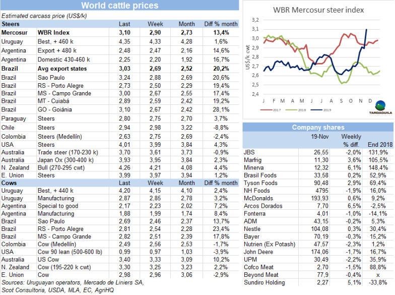 受巴西價格強勢增長影響,南方共同市場閹牛平均價格強勢增長,南方市場閹牛價格指數本周上漲20美分,上漲至至3.1美元/公斤,達到自2016年10月三年多以來最高水平。巴西直接出口中國的工廠增加,需求端對相對短缺的供應端做出反應,本周價格按雷亞爾計算增長了13%,按美元計算增長了12.4%,主要的出口州老公牛平均胴體價格3.03美元/公斤,一周內增長了34美分。阿根廷情況則不同,出口閹牛價格仍然保持10月末的水平,歐洲需求的減少對價格有一定影響。巴拉圭市場更加穩(wěn)定,胴體價格2.8美元/公斤,達到3月初至今最高。烏拉圭特種閹牛價格達歷史最高,胴體價格4.35美元/公斤,在接下來的幾天價格會趨于平緩。