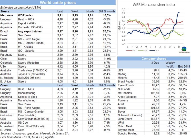 巴西育成牛價格按雷亞爾計算下降,烏拉圭牛價相似的下行導(dǎo)致世界牛肉周報閹牛價格下跌2美分,胴體價格下降至3.21美元/公斤。巴西貨幣再次升值的影響大過育成牛當(dāng)?shù)貎r格上漲1美分,上漲至3.27美元/噸。烏拉圭仍任是南方共同是價格最高好的地區(qū),但本周美元價值下降約10美分,特種草飼閹牛成交價4.18美元/公斤。阿根廷和巴拉圭本周參考價格穩(wěn)定,阿根廷出口胴體價格仍然保持2.47美元/噸(包含出口稅),巴拉圭胴體價格2.8美元/噸。