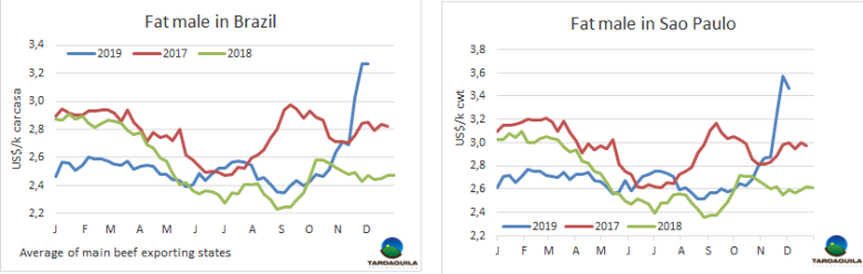 11月末巴西牛肉出口急劇增長。11月最終發(fā)貨量155582噸。僅比上個月16萬噸的紀(jì)錄減少2.8%,比2018年同月增長2.5萬噸,增長19.2%。平均出口價格月增長8.6%,增長至4858美元/噸,是2018年7月以來最高。2019年前11個月,巴西出口鮮牛肉137萬噸,比2018年同期增長12%。