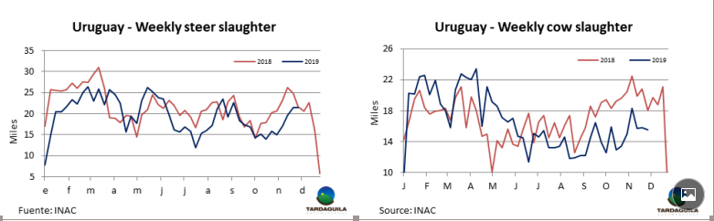 下半年截至目前,牛只屠宰總量312453頭,比2018年同比減少20%,2018年同期屠宰總量38.8萬頭,今年年中母牛屠宰活動中斷,在經(jīng)過一段時期的生長,閹牛存欄量低的問題得以克服,現(xiàn)在閹牛存欄量仍然很低,半年內(nèi)減少了14%,但比母牛減少量小。同時,小母牛屠宰量有輕微增長,從5000頭增長至137000頭。據(jù)烏拉圭肉協(xié)報道,過去一周,屠宰場共屠宰牛只46584頭,比前一周減少320頭,比去年同期減少3000頭,閹牛屠宰量增長0.3%,增長至21485頭。小母牛屠宰量本周增長2%。相反,母牛屠宰量減少1.7%,減少至15497頭。屠宰量組最大的三個工廠是Las Piedras(4471頭),Marfrig-Tacuarembo(4303頭),Minerva-Carrasco(4258頭)。Marfrig4家廠總屠宰量13022頭,比上周增長561頭。Minerva2家廠總屠宰量7617頭,比上周減少727頭。11月截至目前共屠宰牛只189493頭。比2018年同比減少3.8萬噸。