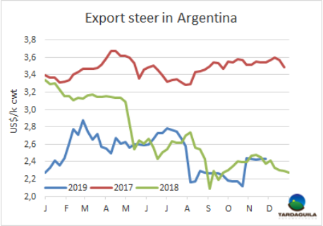 中國市場情況復(fù)雜,官方對于降低消費(fèi)者購買價格的介入嚴(yán)重影響到私有企業(yè)。據(jù)了解,幾周前上海進(jìn)博會上高價成交被取消。由于流動資金受到影響,進(jìn)口商付款有延誤,有經(jīng)驗的公司虧錢出貨,平均每噸虧損1500美元。因此短期內(nèi)市場走勢充滿不確定性。盡管大家普遍認(rèn)為市場需求堅挺,但價格卻并不堅挺。阿根廷統(tǒng)牛成交價受新批準(zhǔn)出口商進(jìn)入中國市場影響,有急劇下行。