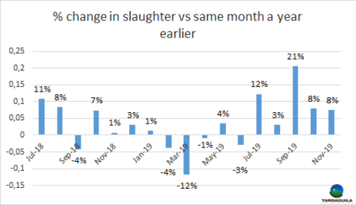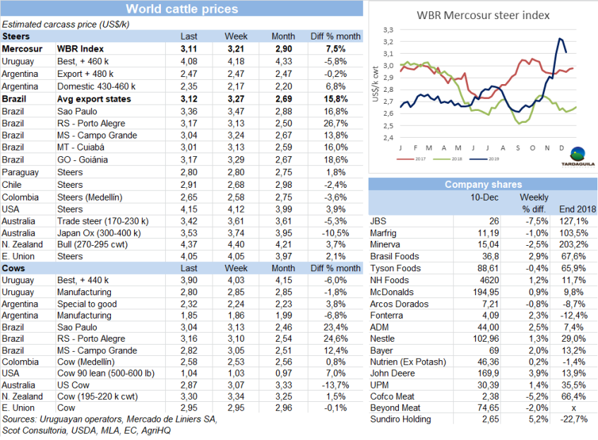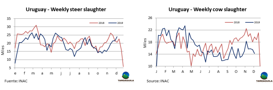 上周牛只屠宰量提高,一部分由于是歐洲481配額牛只生產(chǎn),還因?yàn)槿彼臍夂驙顩r導(dǎo)致草飼牛供應(yīng)增長。烏拉圭肉協(xié)報(bào)道,截至12月7日的一周合規(guī)屠宰場屠宰牛只47124頭,比上一周增長1.2%,(增長540頭),創(chuàng)5月最后一周至今6個(gè)月以來新高。由于屠宰活動(dòng)集中于1月1后下一季度481配額牛只生產(chǎn),閹牛和小母牛占大多數(shù),閹牛屠宰量24034頭,比上周增長2549頭,達(dá)5月25日以來周屠宰量最大。小母牛屠宰量比上周減少,但仍然很高(7767頭),母牛屠宰量減少1229頭,減少至14268頭。全球屠宰量與去年同期幾乎相同,但構(gòu)成卻大不相同:閹牛和小母牛屠宰量增長5000頭以上,母牛屠宰量減少5.4萬頭以上。屠宰量最大的三個(gè)工廠是Las Piedras(4020頭),NH-BPU(3986頭),Marfrig-Tacuarembo(3523頭)。Marfrig4家廠總屠宰量13155頭,屠宰量是2月中旬以來最大。Minerva2家廠屠宰量6762頭。