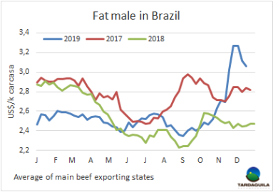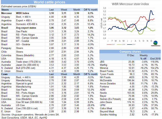 巴西和烏拉圭繼續(xù)壓低當?shù)赜膳r格,而阿根廷稅率的變化抬高了閹牛出口價格。因此,南方共同市場閹牛價格指數(shù)下降1美分,胴體價格下降至3.1美元/公斤。巴西本周凈差額再次下降,盡管近幾天顯示出穩(wěn)定趨勢,本周雷亞爾升值2%不足以扭轉育成牛價格的下跌,價格按美元計下跌6美分,胴體價格下降至3.06美元/公斤。烏拉圭閹牛價格持續(xù)下跌,報價4美元/公斤,并將繼續(xù)下跌。阿根廷出口閹牛比索價格在穩(wěn)定了幾周之后本周開始上漲。我們必須考慮到稅率上漲使出口同等數(shù)量的肉變得更加昂貴。本周參考價格指數(shù)上漲23美分,胴體價格上漲至2.7美元/公斤。巴拉圭育成牛胴體價格連續(xù)第五周保持2.8美元/公斤。