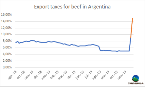 上任一周以來,宣布一系列聲明后,基什內(nèi)爾政府阿爾貝托·費爾南德斯希望國會今天批準《經(jīng)濟緊急狀態(tài)法》草案,該草案于昨日在議會上提交,將賦予他非凡的權力,在許多微妙的問題上避免立法的干預。此前,上周六發(fā)布了一項法令通過更改百分比,修改了前任政府2018年9月恢復出口加征關稅的規(guī)則,以前每出口1美元征收一定數(shù)量阿根廷比索的稅。(每出口1美元牛肉征收3阿根廷比索)。整體性的規(guī)則還未明確,大致分析的結果是牛肉的有效出口稅被定在9%,比15個月前打算加征的8%高1個百分點,考慮到比索貶值的影響,出口稅的數(shù)額比上周增長了4.2個百分點。該措施導致大豆出口稅率達30%,糧食和其他油籽稅率為12%。昨天,所有這些推理都變得抽象,因為在政府希望今天獲得批準的經(jīng)濟緊急措施系列計劃中,對大豆的出口稅改為了33%,對2018年9月2日(馬克里重新征收出口稅之前)沒有涉及的產(chǎn)品,例如小麥,玉米和牛肉征收出口稅15%。根據(jù)當前的閹牛出口價格,按照稅率增長9%計算,每公斤胴體將被征收額外的17美分,如果稅率變?yōu)?span>15%,進口稅將增長約38美分。