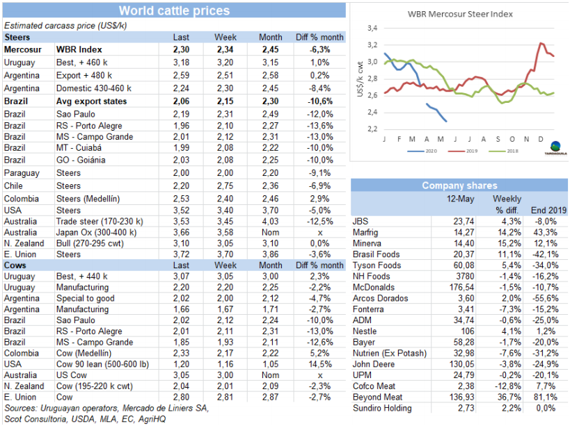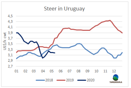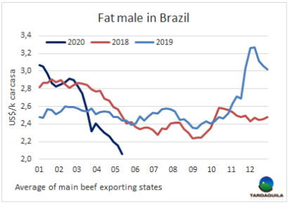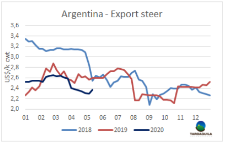 與出口到國內市場的工廠相比,直接出口到中國市場的肉類加工廠要多花10雷亞爾采購出口至中國的適齡牛(30個月齡以下),這反映了出口相對于國內需求的卓越競爭力。這主要是由于雷亞爾疲軟,昨天雷亞爾兌美元匯率為5.87。在上周日母親節(jié)(通常在每個月的月初)出現(xiàn)額外需求之后,巴西國內市場對牛肉興趣不大,新冠疫情危機中,消費者趨向于選擇更便宜的蛋白質。圣保羅育成牛參考價193雷亞爾/15公斤,較上周下跌1美分。預定時間拉長至9天左右,其他州,例如米納斯吉拉斯,預定時間拉長至11天。不同地區(qū)價格走勢不同,戈亞尼亞州價格有回漲,參考價在178.5雷亞爾/15公斤。
