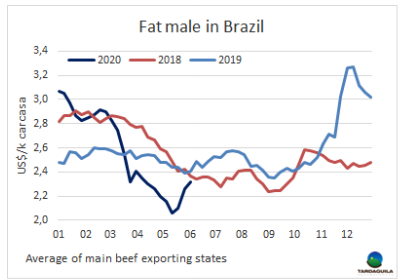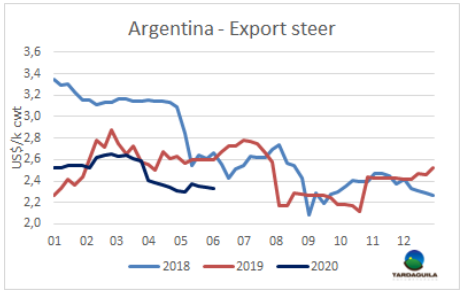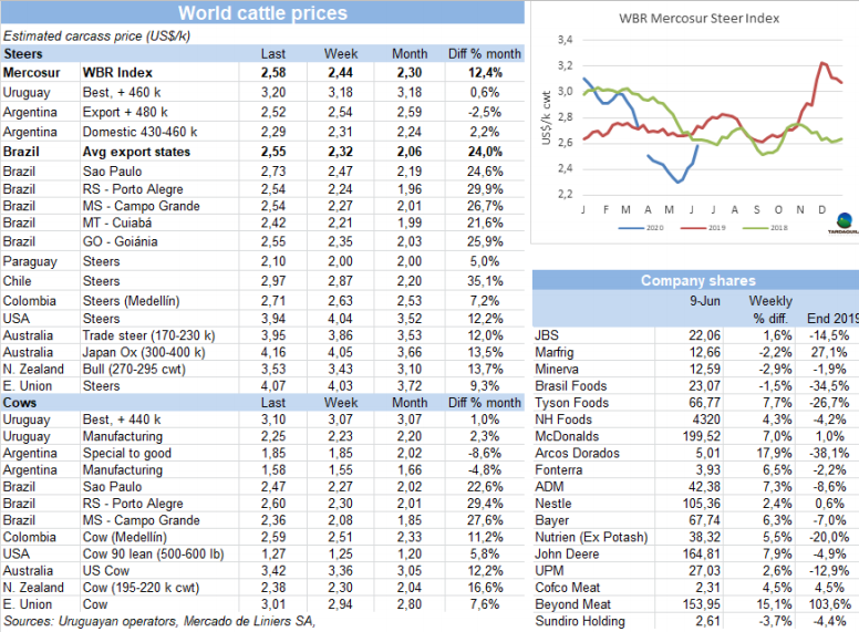 本周南方共同市場(chǎng)閹牛價(jià)格急劇上漲,達(dá)到三月中旬疫情剛剛開始在南美地區(qū)蔓延時(shí)的價(jià)格水平。本周南方共同市場(chǎng)閹牛價(jià)格上漲14美分,上漲至2.58美元/公斤。巴西活牛價(jià)格上漲是主導(dǎo)因素,但巴西不是牛價(jià)上漲唯一的原因。本周雷亞爾增值6.7%,較5月中增值17%。經(jīng)濟(jì)危機(jī)期間通貨膨脹急劇下降,給貨幣當(dāng)局大幅降低市場(chǎng)基準(zhǔn)利率的空間。巴西主要出口州育成牛價(jià)格上漲了5.3雷亞爾/15公斤,上漲至187.1雷亞爾/15公斤,達(dá)3月末以來最高。巴拉圭牛價(jià)在連續(xù)5周穩(wěn)定之后也有上漲,烏拉圭市場(chǎng)堅(jiān)挺,只有阿根廷牛價(jià)受匯率變化的影響有所下跌,但出口閹牛價(jià)格穩(wěn)定在160比索/公斤。