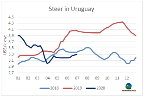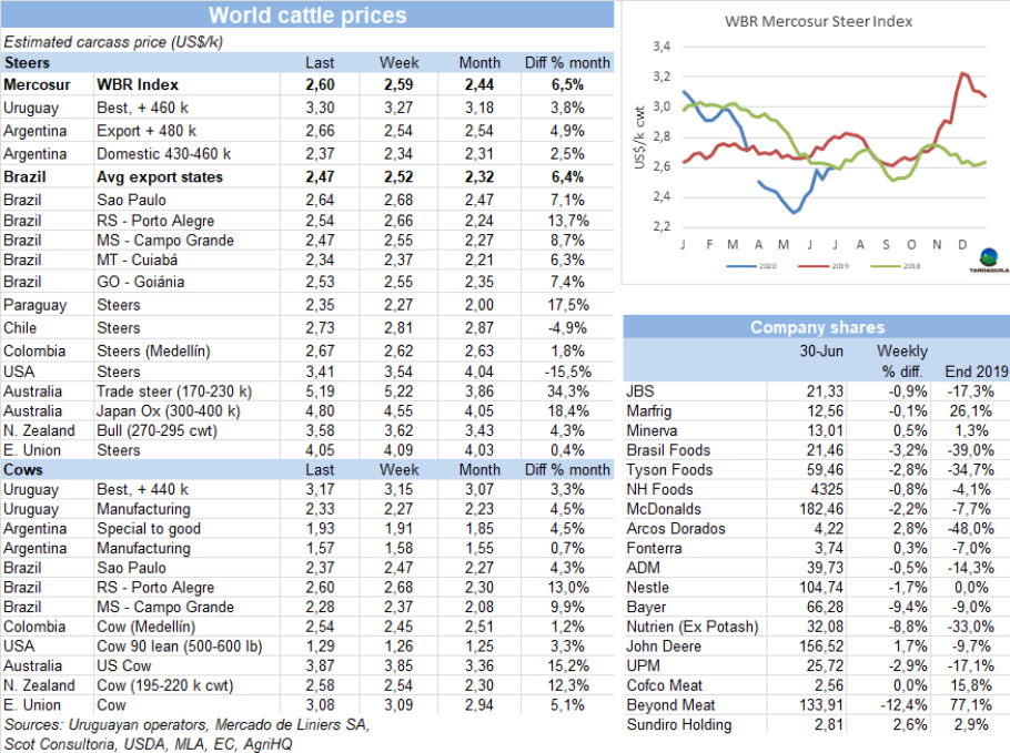 本周南方共同市場閹牛平均價格覆蓋了巴西貨幣疲軟帶來的價格下行。受疫情擴散帶來的擔憂影響,巴西貨幣兌美元匯率下跌6.1%。盡管巴西育成牛平均價格上漲8雷亞爾/15公斤,上漲至202.8雷亞爾/15公斤,其美元價格下跌了5美分,下跌至2.47美元/公斤。南美地區(qū)其他國家育成牛價格均上行,尤其在阿根廷,活牛供應短缺以及冰鮮產(chǎn)品到歐洲的出口價格拉動出口閹牛價格上漲10比索/公斤。美元價格達到2.35美元/公斤。烏拉圭方面供應短缺導致活牛參考價上漲3美分,上漲至3.3美元/公斤。WBR南方市場閹牛價格指數(shù)上漲1美分,至2.6美元/公斤。