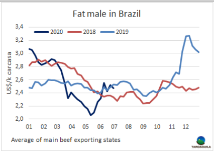 上周巴西主要牛產(chǎn)區(qū)育成牛價格強勁上漲,圣保羅州上周五活牛價格指數(shù)達218.35雷亞爾/15公斤,較前一周成交價上漲8雷亞爾/15公斤。本周價格增長最明顯的地區(qū)戈亞尼亞(上漲10雷亞爾至207雷亞爾/15公斤),圣保羅(上漲了9.5雷亞爾,上漲至216.5雷亞爾/15公斤)30天內(nèi)付款。圣保羅做出口業(yè)務的工廠出價高達220雷亞爾/15公斤。那些做國內(nèi)屠宰的工廠出價低5-10雷亞爾/15公斤。供需雙方都比較樂觀,由于價格預計將繼續(xù)上漲,牛只供應不足,牧草條件依然良好,生產(chǎn)者可以壓欄,價格預期繼續(xù)上漲。期貨預訂時間很短,從4天到5天不等。從需求端看,庫存很低,而且接近月初,人們預計銷售情況會好轉(zhuǎn)。此外,7月6日起圣保羅酒吧和餐館的可能重新開放,也為市場帶來積極的氣氛。