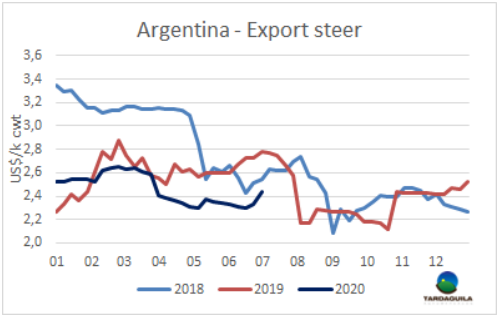 2019/20財年活牛出口量再次下跌。據(jù)統(tǒng)計,6月20日至7月19日,活牛出口總量127932頭,其中出口至土耳其105884頭,占總出口量的83%。這一數(shù)量是2018/19財年活牛出口量261000頭的一半,較2017/18財年歷史最大出口量451000頭的72%,當時到土耳其出口量405000頭。近幾周,土耳其頒布了新的進口許可,市場有消息稱烏拉圭將占8萬頭的份額,巴西占12萬頭,歐洲約占10萬頭。