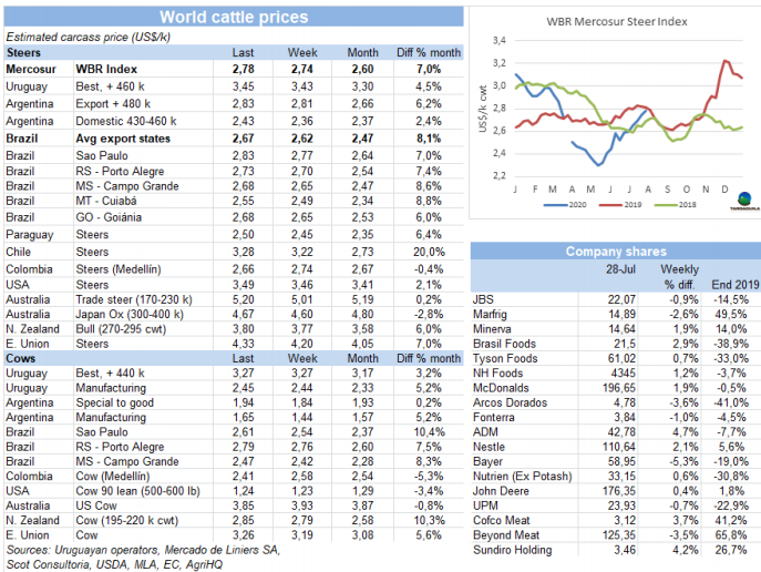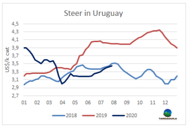 上周牛屠宰量增長超過6000頭,達(dá)六月末至今四周以來最高。烏拉圭肉協(xié)報(bào)道,截止7月25日的一周內(nèi),牛屠宰量37487頭,較上周增長了20%,同比增長了10%。周屠宰量最大種類是閹牛,閹牛屠宰量較上周增長了2821頭,增長至19364頭,母牛屠宰量的也有同水平的增長,增長了2895頭,增長至12664頭。屠宰量最大的工廠是Marfrig-Tacuarembó (5040頭),Athena-Pulsa(4949頭)和Las Piedras(3734頭)。Marfrig兩家工廠屠宰量8746頭,美麗華兩家工廠屠宰量7803頭。距月末僅余一周的時(shí)間,7月牛只屠宰總量124716頭,較2019年同期130375頭稍有減少。由于牛肉行業(yè)工會(huì)周二舉行了長達(dá)24小時(shí)的罷工,本周的屠宰活動(dòng)可能會(huì)減少。