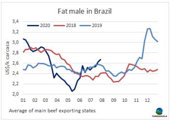 本周南美國家待宰牛價(jià)格上漲,上漲趨勢受到密切關(guān)注。南方共同市場閹牛價(jià)格指數(shù)上漲4美分,至2.78美元/公斤,達(dá)三月上半月新冠疫情在南美地區(qū)爆發(fā)以來新高。較五月中旬牛價(jià)低點(diǎn)時(shí)上漲了48美分,上漲了21%。巴西,按本地雷亞爾計(jì)的成交價(jià)再次上漲。本周美元在全國范圍內(nèi)下跌,而巴西雷亞爾升值1.2%。巴西主要出口周育成牛價(jià)格上漲5美分,上漲至2.67美元/公斤。巴拉圭由于在口蹄疫接種階段活牛供應(yīng)量少,價(jià)格保持上漲趨勢。阿根廷和烏拉圭活牛參考價(jià)本周上漲2美分,分別上漲至2.83美元/公斤和3.45美元/公斤。烏拉圭目前已經(jīng)看到價(jià)格上漲趨勢將在本季度后停止。