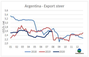 美國市場已成為阿根廷在中國市場低迷時(shí)期的補(bǔ)救措施:今年6月,阿根廷對美國胬肉銷售量達(dá)到2196噸,較5月增長308%,占美國年度總配額20000噸的10%以上。六月對美國出口的冰鮮牛肉平均價(jià)格6131美元/噸,冷凍牛肉平均價(jià)格4201美元/噸。因此,6月成為自2018年底恢復(fù)對美出口以來銷量最好的一個(gè)月。2020年至今,阿根廷已經(jīng)向美國出口牛肉6440噸,出口額超3300萬美元。