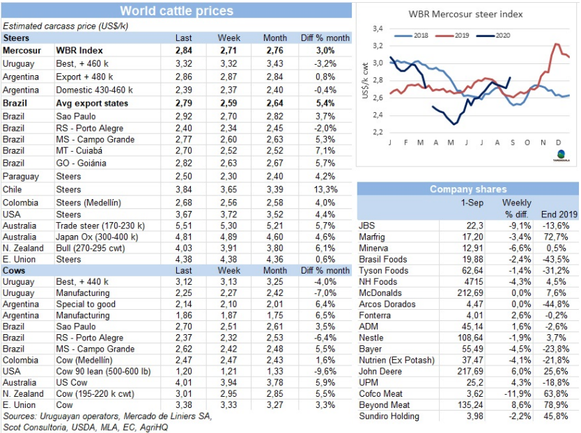 本周受巴西和巴拉圭方面牛價(jià)強(qiáng)勁拉動,南方共同市場閹牛價(jià)格指數(shù)較上周上漲了13美分,上漲至2.84美元/公斤。巴西待宰牛雷亞爾價(jià)格上漲,主要出口州育成牛均價(jià)上漲了3.2%,上漲至225.8雷亞爾/15公斤,本周雷亞爾增值3.9%,美元參考價(jià)上漲了20美分,上漲至2.79美元/公斤。巴拉圭活牛供應(yīng)減少,育成牛價(jià)格也上漲了20美分,上漲至2.5美元/公斤。阿根廷和烏拉圭出口閹牛價(jià)格保持穩(wěn)定。