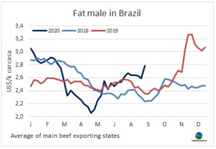 8月巴西牛犢的平均價(jià)格同比上漲了約56%,漲幅高于育成牛的價(jià)格漲幅。全年補(bǔ)欄率大幅上升。犢平均體重180公斤的8個(gè)月斷奶的牛,報(bào)價(jià)每公斤11.1雷亞爾,比2019年8月的平均價(jià)格7.11雷亞爾/公斤高出56%。”同一時(shí)期,主要出口州,育成牛價(jià)格增長了47%,從146.2雷亞爾/15公斤增長到214.7雷亞爾/15公斤。補(bǔ)欄率增加到1.49,鼓勵(lì)育種者在繁殖群中保留母牛,母牛的屠宰供應(yīng)減少。
