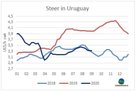 八月烏拉圭牛肉出口量下降,主要由于對中國出口量下降。把月烏拉圭對中國出口牛肉11787噸,較七月出口量減少了1525噸,同比去年下降了近6900噸。2020年1-8月,烏拉圭對中國牛肉出口總量101660噸,較去年減少了47500噸(減少了32%),達(dá)2016年以來同期最低。8月牛肉出口總量達(dá)22748噸,平均離岸價(jià)為5417美元/噸。與7月相比,出口量減少了2200噸,而平均價(jià)格上漲了9%,原因是冰鮮牛肉的比例增加了,而且中國的冷凍牛肉價(jià)格提高了100美元/噸。八月第二大出口目的國是美國,烏拉圭對美國牛肉出口量2426噸,其次是俄羅斯(820噸)和以色列(792噸)。