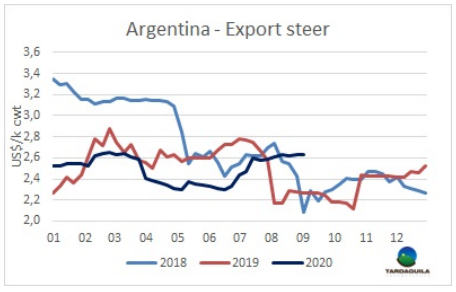 八月烏拉圭對歐洲出口冰鮮牛肉3326噸,達(dá)2018年五月以來月出口量最大。2020/21財(cái)年的希爾頓配額出口量和10月1日開始的481配額出口量都為出口量的增長做出了貢獻(xiàn)。平均出口價(jià)格為9596美元/噸,與十月價(jià)格相當(dāng),較2019年八月出口價(jià)增長了200多美元。