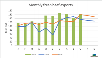 澳大利亞長期的干旱和季節(jié)性條件的改善導致活牛供應緊張,因為生產者繼續(xù)重建牛群。因此,到印度尼西亞出口的體重較小的閹牛價格在2020年達歷史最高,9月的平均價格比去年同期高出13%。由于供應受限和價格高位,出口量遠低于一年前的水平。9月活牛出口量達7.8萬頭,較去年同月回落28%。今年1-9月的出口量較2019年水平回落了12%。MLA的養(yǎng)牛業(yè)預測 10月更新表明,2020年活牛出口預計將下降16%,主要是由于澳大利亞北部供應水平的下降。