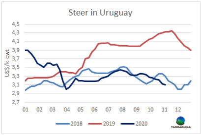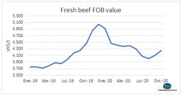 歐洲市場繼續(xù)受到第二波新冠疫情的影響。德國餐館將近四周處于關閉狀態(tài),阿根廷希爾頓臀腰肉的成交價也反映了這一事實。有人提供希爾頓臀腰肉成交價6500-7000美元/噸,因為大多數工廠只能選擇把這些產品冷凍起來,除此之外別無選擇,只能把庫存賣掉。烏拉圭方面大多數工廠選擇從目前的貿易中撤退。無論如何,工廠相信,如果在11月剩余時間內病毒的傳播能夠得到控制,12月的需求可能會有所變化。最令人擔憂的問題之一是481配額的谷飼牛的數量。原則上,歐洲客戶要求的是將生產推遲2-3周。目的是盡可能延長貨物的到港時間,以延長售賣時間,希望疫情可以開始改善。如果把客戶案例逐個分析,首先的想法是盡快裝船,以便貨物可以在一月初清關,利用配額窗口的關稅優(yōu)勢,然后冷凍起來轉賣給進口商。工廠稱最有效的辦法是把活牛留在育肥場,等到下個季度配額開始(4-6月)再進行屠宰。我們有信心歐洲市場將迅速恢復起來,經過短暫的封鎖之后市場將在30-40天內恢復正常。