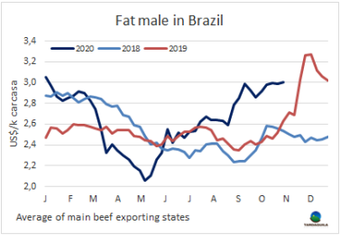 供應短缺、月初的高需求和出口市場的良好表現繼續(xù)支撐巴西主要牛產區(qū)活牛價格上漲。圣保羅方面參考價達270雷亞爾/15公斤。為中國市場準備的小閹牛價格能多賣2雷亞爾/15公斤。批發(fā)市場價格受月初需求拉動也有上漲,十月胴體參考價17.8雷亞爾/公斤,較上月上漲約10%。批發(fā)市場后部位肉緊缺,接下來幾天價格可能再次上漲。