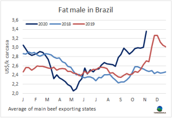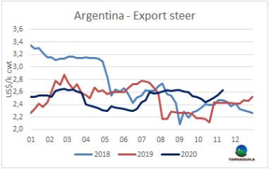 全球經(jīng)濟(jì)發(fā)展情況樂觀促使新興國家貨幣大幅升值,南方共同市場閹牛平均價(jià)格隨之上漲。輝瑞公司宣布新冠疫苗的有效性高達(dá)90%,拜登在美國大選中獲勝,預(yù)期對(duì)中國的敵意將被擱置,改善了市場情緒。股市指標(biāo)大幅上升,包括雷亞爾在內(nèi)的新興國家貨幣也大幅上升。本周巴西貨幣兌美元升值6%。巴西待宰牛供應(yīng)仍然十分緊缺,按雷亞爾價(jià)格繼續(xù)上漲。貨幣升值和本地牛價(jià)上漲拉動(dòng)主要出口州育成牛價(jià)格暴漲36美分,上漲至3.36美元/公斤,達(dá)南美地區(qū)牛價(jià)最高。圣保羅育成牛價(jià)格本周上漲33美分,上漲至3.48美元/公斤。阿根廷和巴拉圭待宰牛價(jià)格也有上漲,盡管歐洲市場需求弱,阿根廷出口閹牛價(jià)格上漲了8美分,達(dá)2.87美元/公斤(包含出口稅),巴拉圭牛價(jià)上漲至2.95美元/公斤。南美地區(qū)唯一一個(gè)價(jià)格下跌的國家是烏拉圭,2018年5月以來,烏拉圭牛價(jià)第一次不再是南美地區(qū)最高,下降了3美分,達(dá)2017年以來最低。南方共同市場閹牛價(jià)格上漲了22美分,上漲至3.18美元/公斤。