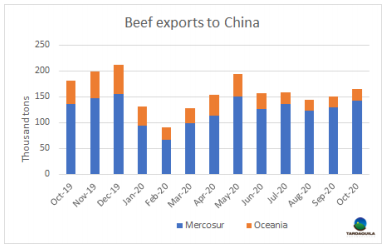 以南方共同市場為主的南美產(chǎn)品在中國進(jìn)口牛肉市場的份額持續(xù)上升。10月南美地區(qū)牛肉出口量出口了14.3萬噸,估計(jì)從阿根廷進(jìn)口4.5萬噸,較9月增加1.3萬噸。澳大利亞和新西蘭對(duì)中國的出貨量增加了不到1000噸,達(dá)21417噸。與去年10月相比,南方共同市場對(duì)中國出口量增長了5%(6565噸),而澳洲對(duì)中國出口量下降52%,減少了2.3萬噸。