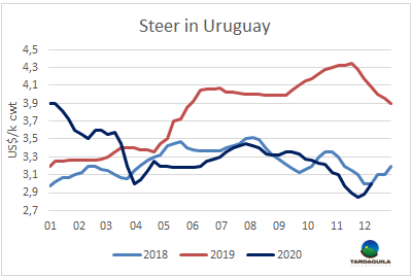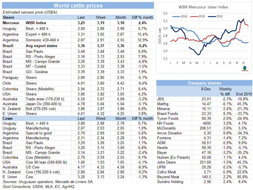 受巴西雷亞爾升值、阿根廷和烏拉圭牛價(jià)顯著上漲拉動(dòng),本周閹牛價(jià)格指數(shù)上漲了6美分,上漲至3.25美元/公斤,達(dá)今年最高。巴西育成牛平均價(jià)格繼續(xù)下跌,但下跌趨勢(shì)被雷亞爾2%的升值完全抵消,主要出口州平均價(jià)格下跌了1美分,下跌至3.36美元/公斤。阿根廷牛價(jià)上漲緊隨巴西牛價(jià)值之后,本周含9%出口稅的出口閹牛價(jià)格上漲了26美分至3.31美元/分,烏拉圭牛價(jià)也有上漲,特種閹牛成交價(jià)恢復(fù)至3美元/公斤,較上周上漲了12美分。巴拉圭牛價(jià)在下跌了幾周之后保持穩(wěn)定。