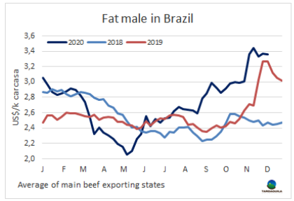 隨著零售購(gòu)買需求逐漸疲軟,育成牛價(jià)格和批發(fā)市場(chǎng)肉價(jià)繼續(xù)下跌。盡管11月出口市場(chǎng)尤其是中國(guó)市場(chǎng)的需求很好,但國(guó)內(nèi)市場(chǎng)需求仍然很慘淡,即使是月初也沒(méi)有任何恢復(fù)獲利的跡象。第三季度的經(jīng)濟(jì)數(shù)據(jù)良好,國(guó)內(nèi)生產(chǎn)總值在經(jīng)歷了前一季度疫情造成的急劇下滑后反彈了7.7%。如果GDP的復(fù)蘇鞏固,國(guó)內(nèi)需求應(yīng)該會(huì)對(duì)持續(xù)低迷的供應(yīng)做出反應(yīng)。本周牛價(jià)下跌了5雷亞爾/15公斤,圣保羅本周初育成牛成交價(jià)268雷亞爾/15公斤,已經(jīng)拉開(kāi)了與11月中旬最高成交價(jià)290雷亞爾/15公斤的差距。預(yù)定時(shí)間拉長(zhǎng),全國(guó)平均預(yù)定時(shí)間約8天,圣保羅為9天。期貨市場(chǎng)價(jià)格仍在下跌,雷亞爾升值可能對(duì)出口商賣貨不利。