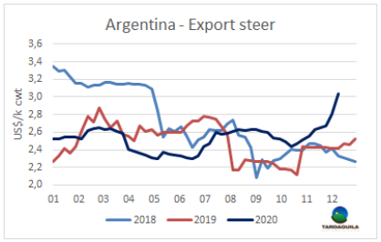 出口牛的價(jià)格在過(guò)去兩個(gè)月急劇上漲。漲勢(shì)最兇的是閹牛,尤其是英國(guó)純種閹牛,10月第一周和12月第一周之間增長(zhǎng)了31.6%。同期,印度串種閹牛價(jià)格上漲了27.7%。特優(yōu)母牛價(jià)格過(guò)去兩個(gè)月累計(jì)增長(zhǎng)23.6%,而主要銷往中國(guó)市場(chǎng)的工業(yè)母牛增長(zhǎng)了25.0%。兩個(gè)月前,市場(chǎng)分析師Victor Tonelli就預(yù)測(cè)到了牛價(jià)上漲,他指出,過(guò)冬犢牛的價(jià)格和飼養(yǎng)成本的比率比從飼養(yǎng)場(chǎng)出欄的活牛價(jià)格高出20%/25%,這使得養(yǎng)殖業(yè)無(wú)法生存,并導(dǎo)致了飼養(yǎng)場(chǎng)空置。