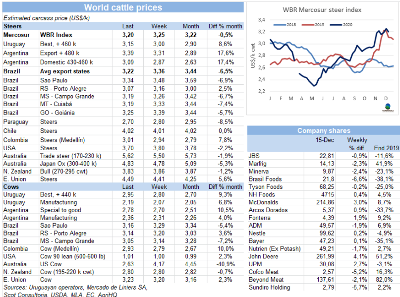 目前還沒(méi)有定論,但進(jìn)口商有意對(duì)1-3月與南美國(guó)家簽訂的猶太屠宰合同重新議價(jià)。一位以色列進(jìn)口商稱,“我們確信,我們將無(wú)法繼續(xù)按目前的價(jià)格對(duì)巴西和巴拉圭支付貨款。”第一次正式談判可能會(huì)在下周舉行,屆時(shí)將看到新的進(jìn)展。一家巴拉圭工廠稱,目前重新談判的牛前部位肉參考價(jià)6000美元/噸的合同是“可行的”。他解釋說(shuō),調(diào)整的空間將主要取決于牛價(jià)是否維持上周的下行通道,育成牛價(jià)格低于3美元/公斤(每公斤2.70美元)0.30美元。