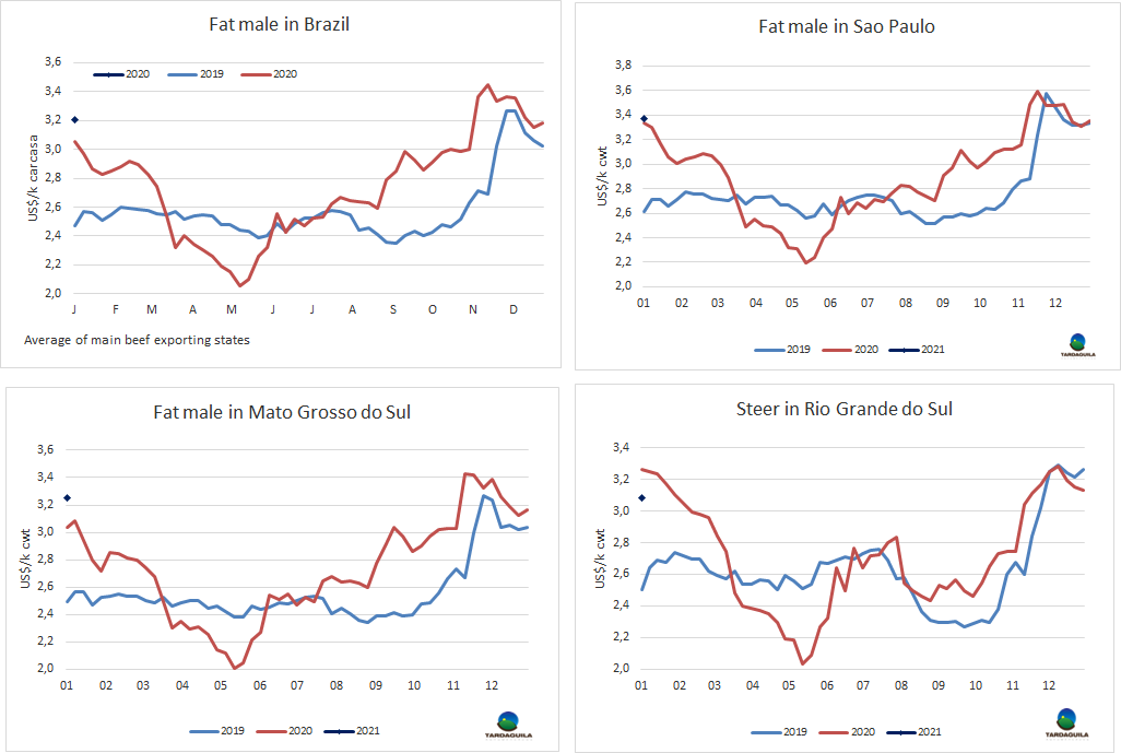 巴西育成牛價(jià)格的下行修正階段很短,2021年第一周,活牛價(jià)格開始回漲,盡管較11月價(jià)格高點(diǎn)仍有差距,昨天圣保羅活牛成交價(jià)266雷亞爾/15公斤,30天付款(適合與出口市場的低齡活牛成交價(jià)高出7雷亞爾)。較上周增長了10雷亞爾/15公斤。市場成交有限,供應(yīng)偏緊。批發(fā)市場后部位肉價(jià)格回漲,昨天參考價(jià)21.1雷亞爾/公斤較上周上漲了40美分,前部位肉價(jià)仍保持穩(wěn)定,14.4雷亞爾/公斤。