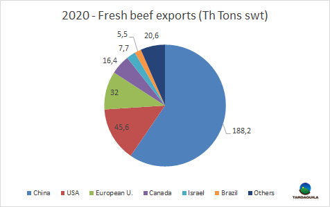 2020年烏拉圭牛肉出口量31.6萬噸,較2019年減少了1萬噸,較2018年最高出口量減少了1.3萬噸,平均出口價(jià)格5105美元/噸,同比下降了7%。對中國出口量18.8萬噸,占總出口量的60%,其中包括74.6萬噸牛副(約占85%)。牛肉的第二出口目的地是美國,對美國出口量4.6萬噸,占總出口量的14%,第三是歐盟,對歐盟出口量3.2萬噸,占總出口量的10%。其次是加拿大(1.64萬噸)、以色列(7.7萬噸)和巴西(5.5萬噸)。