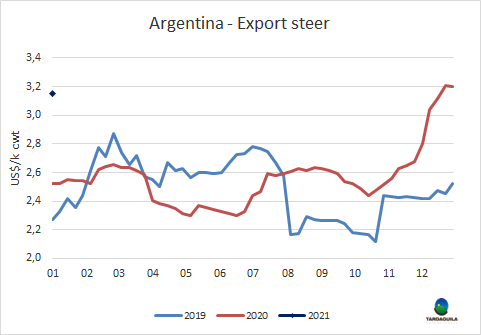 新年之后猶太屠宰業(yè)務(wù)沒有太大轉(zhuǎn)變,牛前部位肉價(jià)格水平和2020年年末一樣,根據(jù)閹牛和母牛的比例以及是否為谷飼,成交價(jià)約6700美元/噸。猶太屠宰目前是很好的替代市場。阿根廷方面價(jià)格也保持上個(gè)月的成交水平,根據(jù)品牌的口碑不同,成交范圍在7700-8200美元/噸。