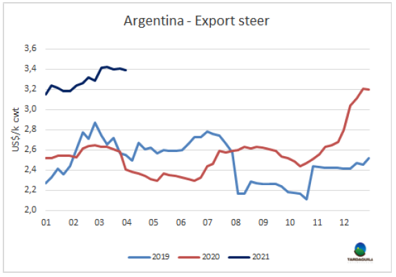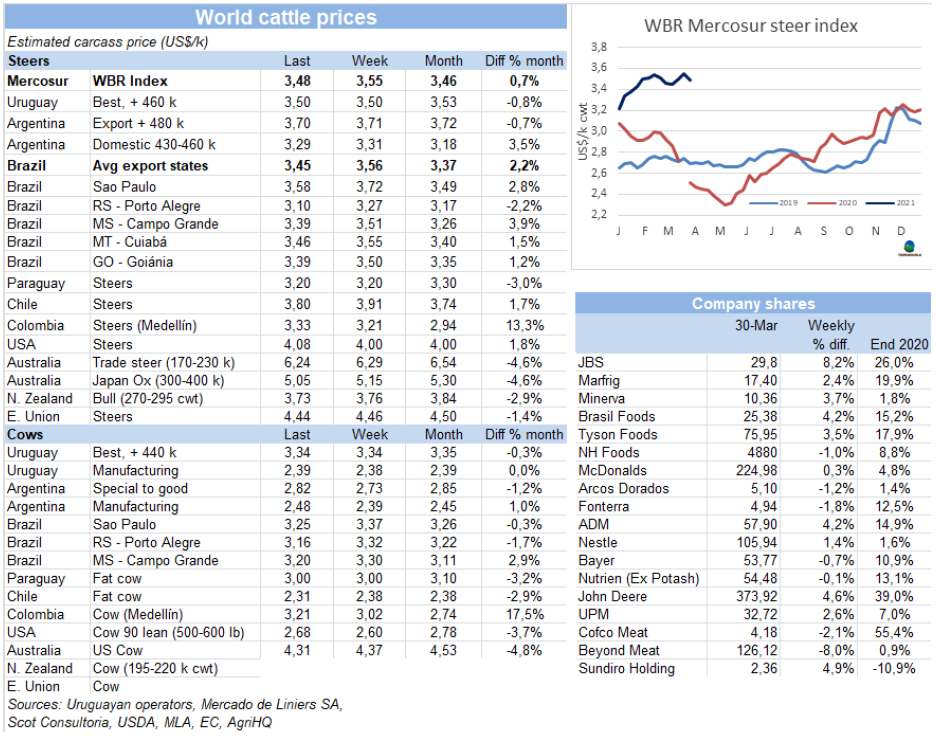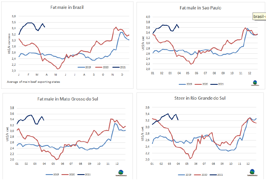 對于疫情發(fā)展的擔憂和巴西內閣部長的換屆給巴西貨幣價值造成影響。巴西雷亞爾較美元貶值了4.4%。因此盡管巴西按雷亞爾計的育肥牛價格繼續(xù)上漲,轉換成美元價格后本周下跌了11美分至3.45美元/公斤。本周其他地區(qū)牛價保持不變。南方共同市場牛價下降了7美分至3.48美元/公斤。