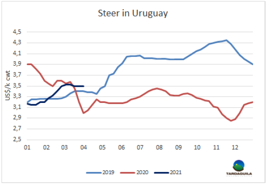 育成閹牛的價格下行持續(xù)時間很短,最近降雨雖然不大,但供應端不急出售。參考價與上周相同,特種閹牛3.5美元/公斤,重型母牛3.3美元/公斤,45天付款包含運費。對母牛的采購興趣要強于閹牛,因為母牛的生產主要是面向中國市場,而歐洲市場非常低迷,猶太屠宰團隊也沒有開工。期貨的預定時間在一周左右。烏拉圭新冠病例不斷增長迫使工廠不得不充分利用工作日全面生產,因為一旦有工廠發(fā)現(xiàn)新冠病例工廠將停工數(shù)日。由于目前的供應相對于需求仍處于短缺狀況,預計復活節(jié)周之后市場將恢復堅挺。