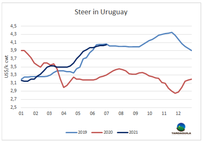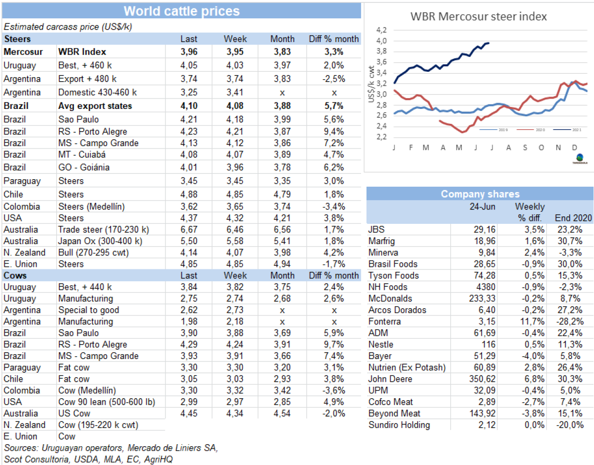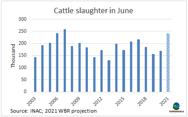 上周牛屠宰量再次增長,據(jù)烏拉圭肉協(xié)報(bào)告統(tǒng)計(jì),截止6月26日的一周,屠宰量56395頭,較上周增長了8000頭,較去年同期增長了18000頭。這是今年屠宰量第三大的一周。盡管481配額的屠宰結(jié)束,燕麥飼養(yǎng)的牛出欄延期,但采購需求堅(jiān)挺帶動(dòng)屠宰量增長,所有種類的牛,無論好壞,都被買走了。本周屠宰量增長最大的是閹牛,本周增加了4301頭至25530頭(+20.3%),母牛屠宰量增加了3181頭至23214頭,小母牛屠宰量增加了457頭,至6250頭。屠宰量最大的工廠是Tacuarembo(4718頭),Ontilcor(4469頭),Las Piedras(4385頭)。Marfrig四家工廠屠宰總量14380頭, Athena三家工廠屠宰總量12164頭。據(jù)本月結(jié)束僅剩3個(gè)工作日,六月屠宰量已達(dá)208093頭,本月屠宰量將超過24萬頭,較2020年六月約增長7萬頭,是6月屠宰量第三大的年份,僅次于2006年和2007年。今年前半年牛屠宰量將達(dá)124萬頭,較去年增長了29.1萬頭,增長了31%。